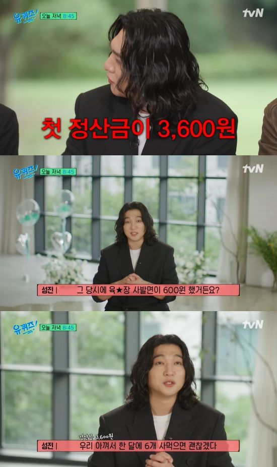 성진은 "첫 정산금이 3600원 들어왔을 거다"라며 "그 당시에 사발면이 600원 정도했다. 그래서 '우리 아껴서 한 달에 6개 사먹으면 괜찮겠다'고 생각했다"고 전했다.