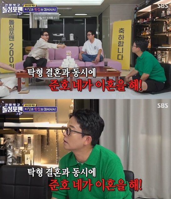 지난 9일 방송된 SBS ‘신발 벗고 돌싱포맨’ 200회 특집에서 이상민은 탁재훈, 임원희, 김준호에게 “200회 동안 여러분은 뭐 하셨냐. 저와 김준호는 결혼을 했다”며 재혼을 자랑했다. 이어 “제가 원하는 게 있다. 프로그램 방향성을 이야기하겠다. 200회에 원희 형 결혼, 400회에 재훈 형 결혼, 그리고 400회에 김준호가 이혼을 해라”라며 김준호에게 이혼을 제안했다.
