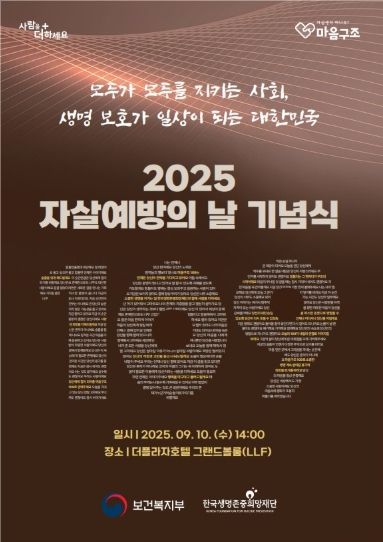 [와이뉴스] 보건복지부와 한국생명존중희망재단(이사장 황태연)은 자살 예방의 날을 맞아 9월 10일 오후 2시에 서울 더플라자호텔 그랜드 볼룸에서'2025년 자살예방의 날 기념식'을 개최했다.