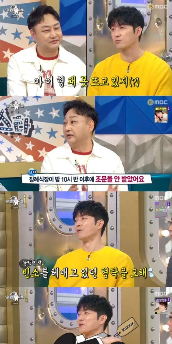 이어 "수용이 형 어머니 부고 듣고 아내를 두고 일본에서 바로 한국으로 왔다"고 했고, 김수용은 "서울대 병원은 밤 10시 30분이 넘으면 조문을 안 받는다. CCTV를 보는데 밤 12시에 누가 있어서 뛰어왔더니 형탁이었다. 검은 옷도 공항에서 사서 입고 왔더라"면서 고마운 마음을 전했다.