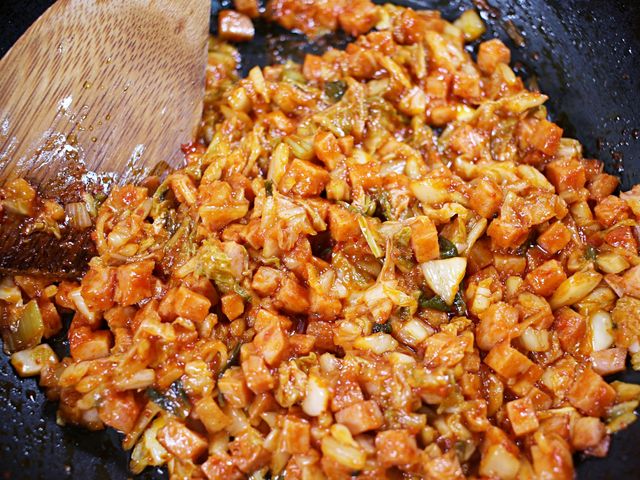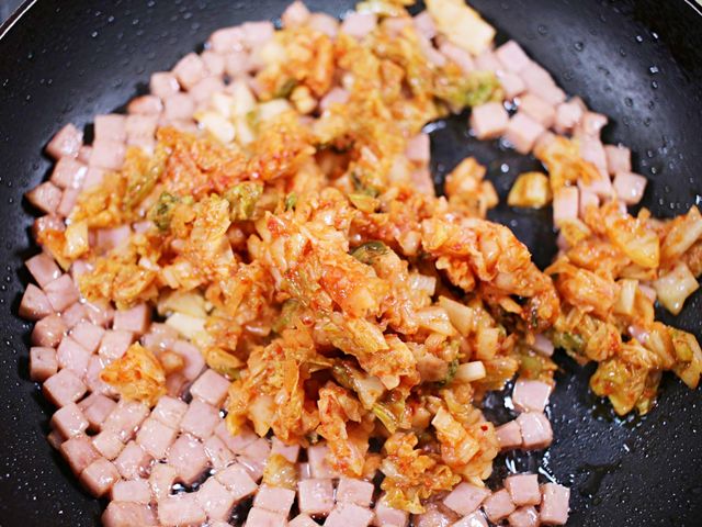 반쯤 익었을 때 김치를 넣고 함께 볶아주세요.