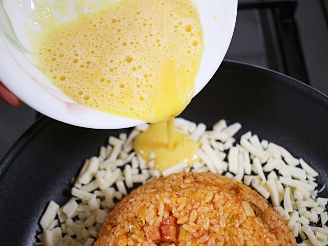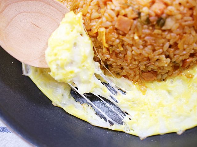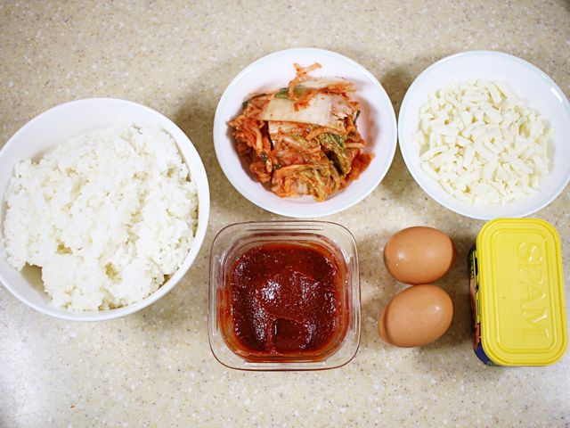 재료는 찬밥, 김치, 달걀, 치즈, 고추장, 햄, 참기름 준비해 주세요.