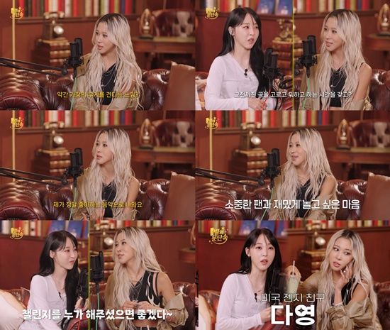 최근 다영은 유튜브 채널 '문별이다 moonbyul2da'의 콘텐츠 '별의 문단속'에 게스트로 출연했다. 이날 다영은 MC인 마마무 문별과 다양한 이야기를 나누며 솔로 데뷔 준비에 한창이었던 근황을 전했다.