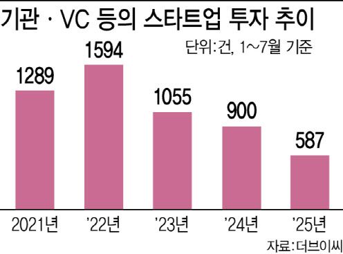스타트업 통계업체 더브이씨에 따르면 투자 유치 이력이 있는 스타트업 중 올해 1~7월 중 폐업한 스타트업은 100곳에 이른다. 작년(95개)은 물론 2023년(65개), 2022년(40개) 같은 기간에 비해 폐업 스타트업 수는 매년 늘고 있다. 창업하는 벤처기업은 줄고, 문을 닫는 벤처는 늘어나고 있다는 뜻이다.