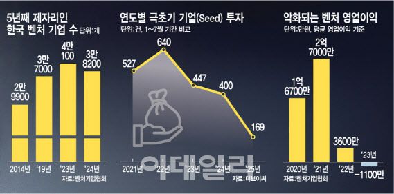 벤처업계에서는 극초기 기업에 대한 투자가 급감하면서 젊은 창업자들의 어깨를 더욱 무겁게 하고 있다고 호소한다. 극초기 기업을 의미하는 Seed 단계의 기업들에 대한 올해 1~7월 투자 건수는 169건을 기록해 전년 동기(400건) 대비 57.7% 줄었다. 상황이 이렇다 보니 젊은 이들의 창업도 줄어드는 모습이다. 중소벤처기업부가 발표한 ‘창업기업동향’에 따르면 올해 상반기 창업자가 30세 미만인 창업 기업수는 전년 대비 14% 감소했다. 서울 구로디지털단지에 소재한 모 전자업체 대표는 “주변 벤처들이 몸집을 줄이기 위해 나이 많은 직원들 부터 내보내는 모습들이 보이며 단지 내 공실도 늘어나는 것 같다”고 분위기를 전했다. 모 벤처기업 사장은 “이공계 기피 현상이 심해지다 보니 젊은 이들의 창업 열기는 시간이 갈수록 줄어들 수밖에 없다”며 “벤처기업들로 유입되는 젊은 인재들의 수준도 과거에 비해 많이 낮아지는 게 사실”이라고 말했다. A 창업 지원 기관은 “인구 감소 등 구조적 요인으로 국내 보다는 해외에서 기회를 찾고 있는 VC들이 늘고 있고 이 때문에 해외 시장을 타깃으로 하는 벤처나 해외 벤처에 투자하는 경우가 증가하는 것도 국내 벤처들에게는 불리한 상황”이라고 설명했다.