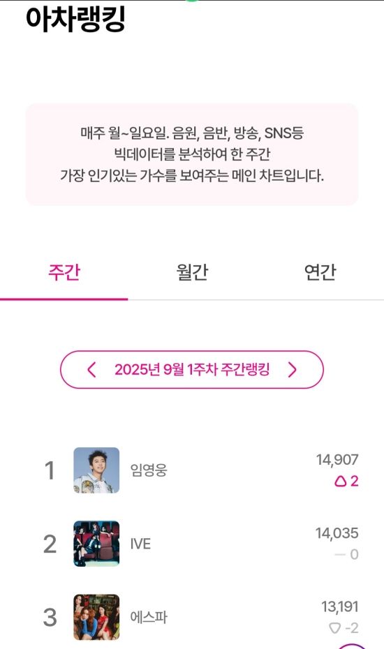 임영웅은 9일 발표된 아이돌차트 9월 1주차(9월 1일~9월 7일) 아차랭킹에서 음원 점수 176점, 유튜브 점수 9,451점, 소셜 점수 5,250점 등 총점 1만 4,907점으로 1위를 기록했다.