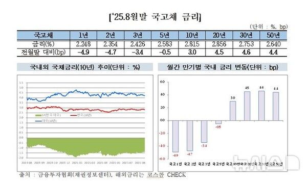 뉴시스 보도에 따르면, 11일 금융투자협회가 발표한 '8월 장외 채권시장 동향'에 따르면 지난달 국고채 3년물 금리는 2.426%로 전월말 대비 3.4%포인트 떨어졌다.