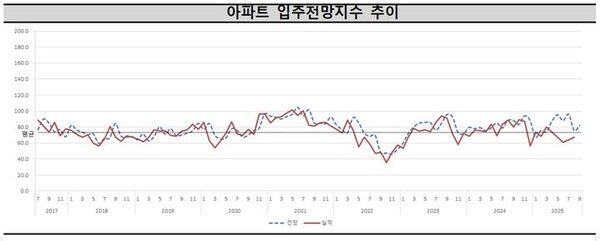 11일 주택산업연구원이 주택사업자를 대상으로 설문조사한 결과, 9월 전국 아파트 입주전망지수는 82.0로 전월(75.7) 대비 6.3포인트(p) 상승한 것으로 조사됐다.