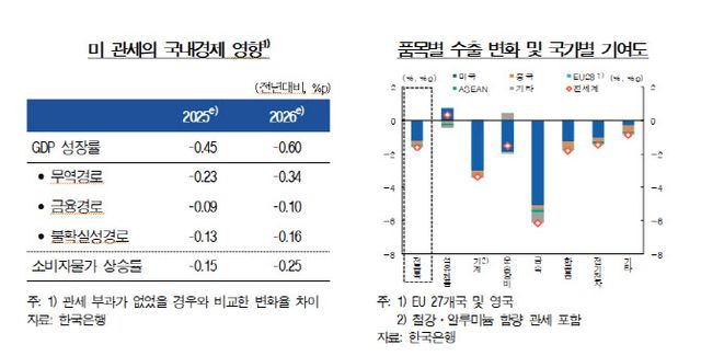 또한 올해 소비자물가 상승률은 0.15%포인트, 내년에는 0.25%포인트 낮아질 것으로 추정했다. 한은은 이번 관세 충격이 물가를 끌어내리는 이유로 수요 위축과 원자재 가격 흐름을 꼽았다.
