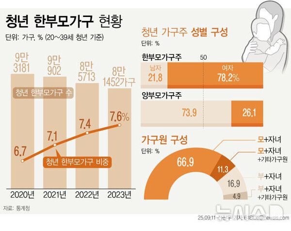 통계청이 11일 발표한 '청년(20∼39세) 한부모가구 사회·경제적 특성 분석'에 따르면 2023년 기준 자녀가 있는 청년 가구는 총 106만4839가구로, 이 가운데 한부모가구는 8만1452가구(7.6%)였다.