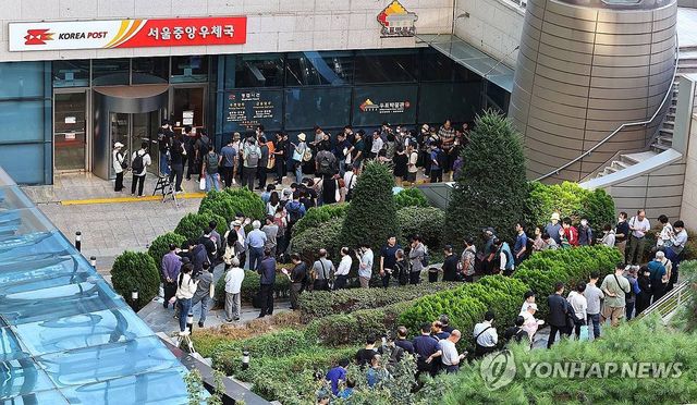 11일 서울 중구 서울중앙우체국 앞에 이재명 대통령 취임 100일 기념우표를 사려는 시민들이 줄을 서고 있다 / 연합뉴스