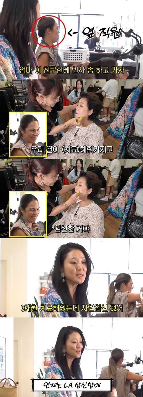 또 샵을 둘러보던 최연제는 "엄마 이 친구한테 인사하고 가자"라며 직원을 소개했다. 선우용여는 "우리 딸이 (치료)해줘서 임신했다고 한다"라며 직원과의 인연을 설명했다. 최연제는 "인공수정하려고 했는데 제가 3개월 치료해서 자연임신 됐다. 그래서 인공수정 취소했다"라고 밝혔다.
