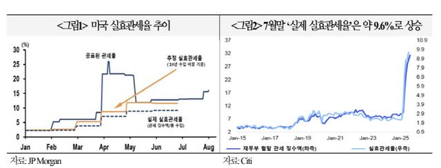 2024년 수입 비중을 기준으로 현재까지 발표된 모든 관세가 실제로 시행된다고 가정할 경우 실효관세율은 16.0%까지 오를 수 있으며, 추후 반도체 품목에 25% 관세가 부과될 경우 최대 20%까지 높아질 가능성도 있다. 그러나 수입대체 효과(아밍턴 탄력성)를 반영하면 최종적으로는 13.3% 수준에서 안정될 것이란 전망이다.