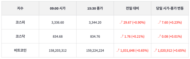 | 한스경제=김도현 기자 | 11일 코스피는 전거래일보다 0.90% 상승 마감했다. 한국거래소에 의하면 코스피 지수는 이날 오전 09시 3336.6에 개장해 장중 3344.7을 고점 기록한 후 오후 3시 30분 3344.20로 상승 마감했다. 전거래일 대비 29.67포인트(0.90%) 상승했으며, 이날 시작가 대비해서는 7.60포인트(0.23%) 상승한 것이다.