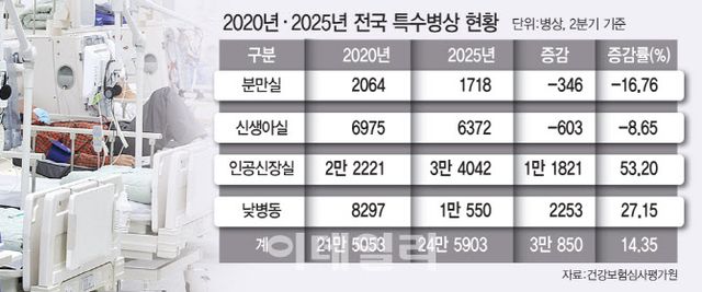 수술실·회복실 병상 등 다른 병상은 꾸준히 늘어나는 추세여서 분만·신생아 병상 감소가 더욱 두드러진다. 전국 특수병상 수는 지난 5년간 14.3% 늘었다. 수술실 병상은 같은 기간 7%가량 증가했으며 회복실 또한 19.3% 늘었다. 전체 특수병상에서 분만·신생아 병상이 차지하는 비율은 4.2%에서 3.3%로 감소했다.