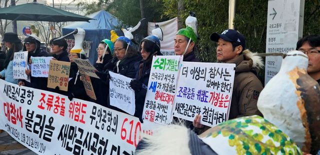 새만금신공항 백지화공동행동 소속 회원들이 국토교통부 청사 앞에서 열린 기자회견에서 2029년까지 건설예정인 새만금신공항의 조류 충돌 위험도가 최근 제주항공 참사가 일어난 무안공항보다 무려 610배라고 주장하며 새만금신공항의 즉각적인 중단을 촉구하고 있다. /뉴스1