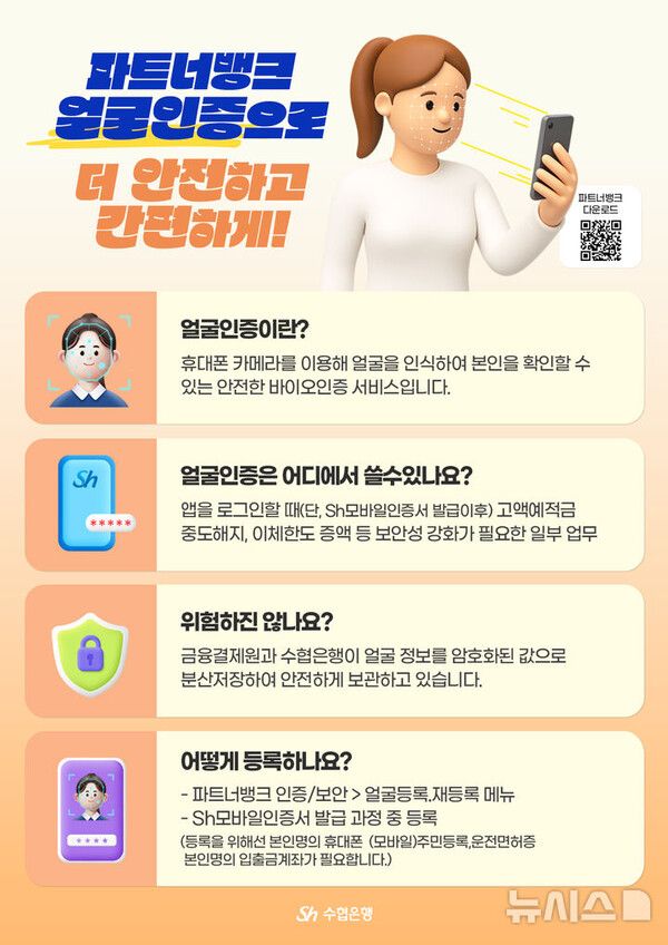 Sh수협은행은 수협 회원조합 고객을 포함해 모바일뱅킹(파트너뱅크)을 이용하는 모든 고객에 대한 '얼굴 인증' 서비스를 강화했다고 11일 밝혔다.