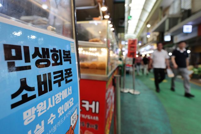 서울 마포구 망원시장 매장에 소비쿠폰 안내문이 붙어 있는 모습. ⓒ 연합뉴스