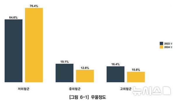 뉴시스 보도에 따르면, 서울연구원이 지난해 9~10월 실시한 '2024년 서울복지실태조사(응답 가구 30004가구)'에 따르면 우울감이 있다고 응답한 사람 중 저위험군 비율은 2022년 64.6%에서 2024년 76.4%로 11.8%포인트 높아진 반면, 중위험군은 19.1%에서 12.8%로 6.3%포인트 낮아졌고 고위험군은 16.4%에서 10.8%로 5.6%포인트 낮아졌다.