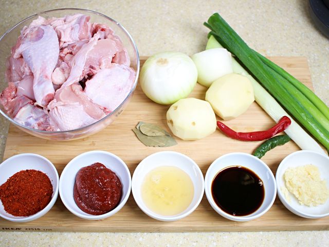 닭(닭볶음탕용 1kg), 감자, 양파, 대파, 청양고추, 월계수잎,