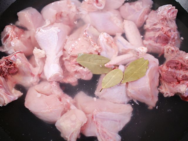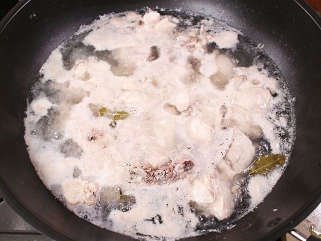 닭과 월계수잎을 넣고 끓여주세요.