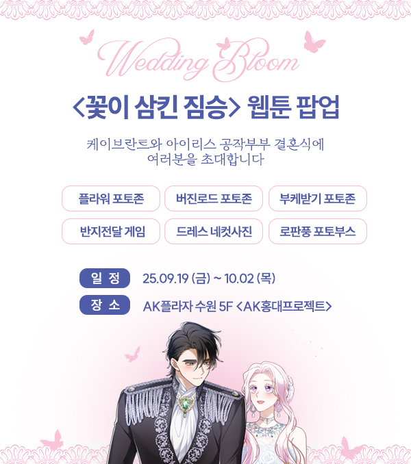 이번 팝업스토어는 작품 속 케이브란트와 아이리스의 결혼식을 현실로 구현한 콘셉트로, 독자들은 주인공들의 웨딩에 하객으로 초대받아 실제와 같은 웹툰 속 이벤트를 체험하게 된다.