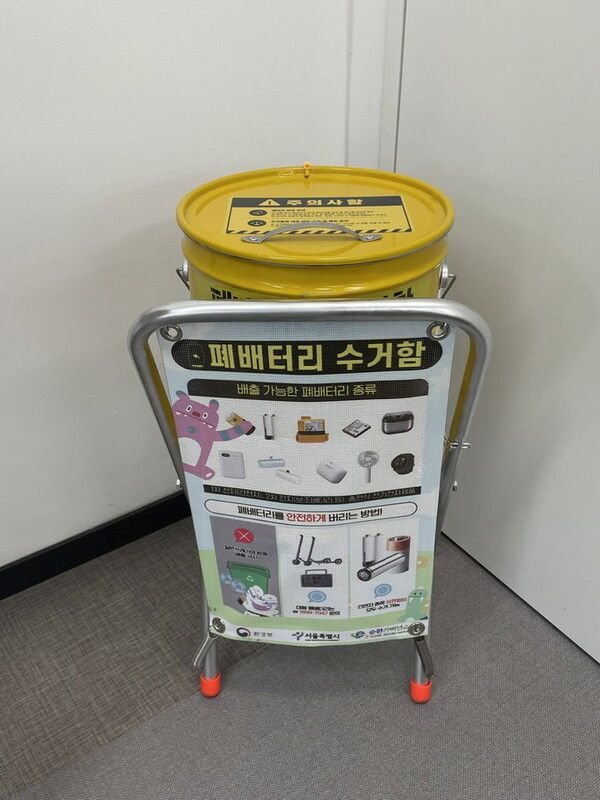 전용 수거함은 정부의 '폐전지 수집·운반·보관 안전 가이드'에 따라 화재 등 안전성을 고려한 뚜껑이 있는 내열 금속 재질로 제작됐다. 휴대폰 배터리, 휴대용 선풍기, 전자 담배, 블루투스 이어폰 등 2차 전지 사용 제품 그대로 전용 수거함에 버리면 된다.