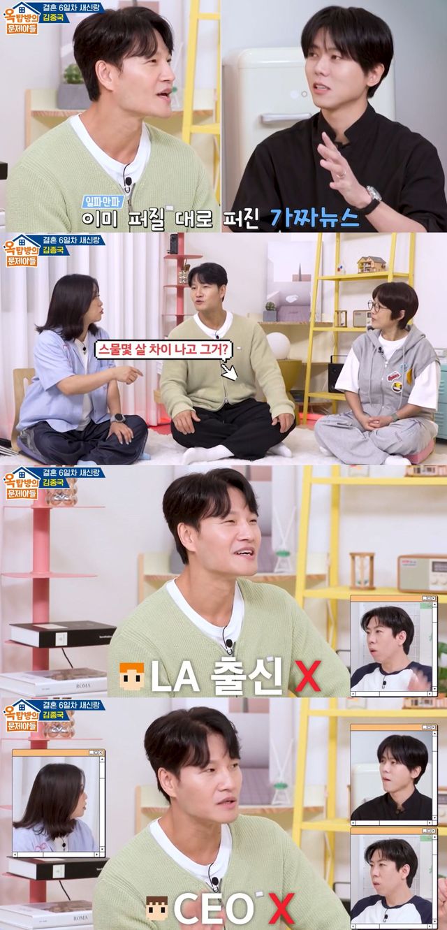 그러자 주우재는 "이미 전국민이 그렇게 알고 있다"라며 김종국의 아내에 대한 '가짜 뉴스'가 많이 퍼졌다고 전했다. 김종국은 출연진들이 언급한 '가짜 뉴스' 속 정보를 하나 하나 부정했다. '아내와 20살 이상 나이 차이가 난다', '아내가 LA 출신이다', '아내가 CEO다' 등 잘못 퍼진 정보를 듣고 황당한 웃음을 보이기도 했다.