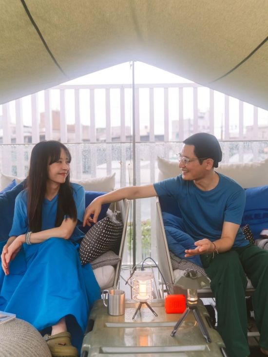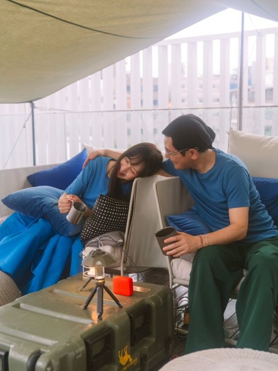 사진 속 두 사람은 파란색 톤으로 맞춘 캐주얼한 차림으로, 야외 캠핑 분위기의 공간에서 함께 차를 마시며 여유로운 시간을 보내고 있다. 서정희는 남편의 어깨에 기대거나, 서로 마주 보며 웃음을 주고받아 훈훈함을 자아냈다.