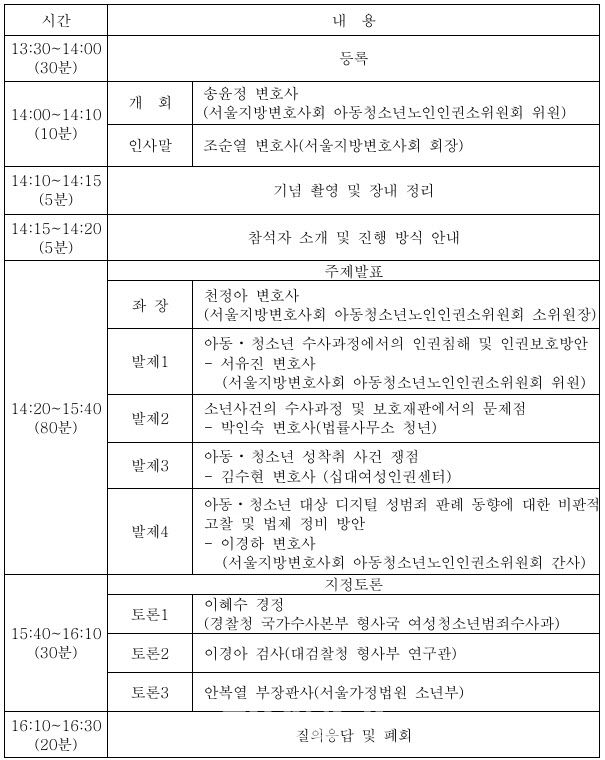 이어 이혜수 경정(경찰청 국가수사본부 형사국 여성청소년범죄수사과), 이경아 검사(서울중앙지방검찰청 인권보호부), 안복열 부장판사(서울가정법원 소년부)가 토론에 나선다. 좌장은 천정아 변호사(서울지방변호사회 아동청소년 노인인권소위원회 소위원장)가 맡는다.
