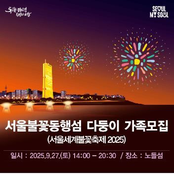 다문화가족, 한부모가족 등 초청 가족 일천 300명과, 선착순으로 접수한 다둥이가족 이천 200명, 총 삼천 500명이 ‘서울불꽃동행섬’에서 불꽃축제를 관람할 수 있다. 다둥이가족 신청은 9월 15일(월) 정오(12:00)부터 서울시 공공서비스 예약(yeyak.seoul.go.kr) 누리집에서 신청하면 된다.