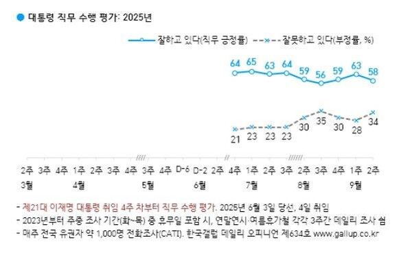 이재명 대통령의 직무 수행에 대해 '잘하고 있다'는 긍정 평가는 58%, '잘못하고 있다'는 부정 평가가 34%라는 여론조사 결과가 12일 나왔다.