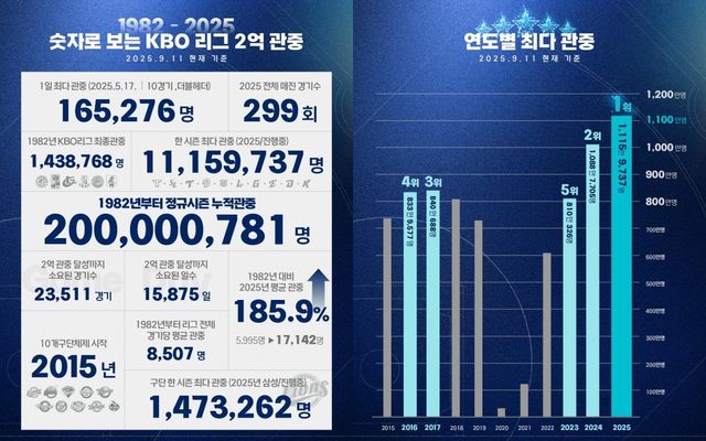 KBO는 11일 경기까지 정규시즌 누적 2억 781명의 관중이 입장해 출범 44년 만에 2억 관중 고지를 밟았다고 12일 밝혔다.
