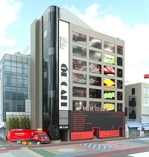 8층 루프탑 '아지트'는 그래피티로 꾸며진 휴식 공간으로, 게임을 통해 롯데리아 교환권·할인권을 받을 수 있으며 공연도 즐길 수 있다.