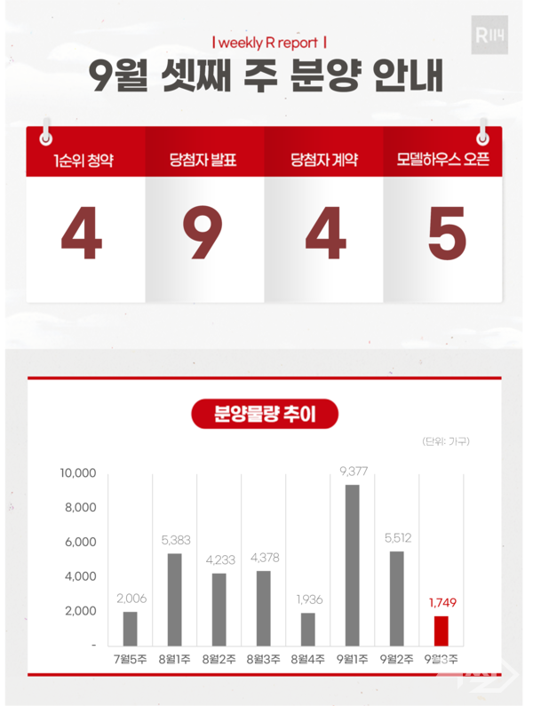 분양시장에서는 9월 셋째 주에 전국 4개 단지, 총 1749가구(일반분양 1449가구)가 공급된다. 경북 고령군 다산월드메르디앙센텀하이, 부산 동구 범일동 퀸즈이즈카운티, 경기 의정부시 녹양동 의정부우정A1(공공분양) 등이 청약 접수를 받고, 경기 광명시 철산역자이, 인천 서구 검단센트레빌에듀시티, 울산 남구 한화포레나울산무거 등은 모델하우스를 오픈할 예정이다.