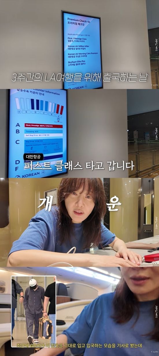 3주간의 LA 여행을 위해 공항을 찾은 엄지원은 "오늘 출국한다. 대한항공의 퍼스트 클래스 찍어보겠다"라며 영상을 시작했다.