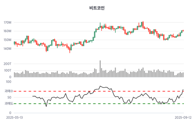 한편 비트코인 가격은 하락 중이다. 코인마켓캡에 의하면, 비트코인은 이날 오후 3시 30분 현재 160,109,328원에 거래 중이다. 161,631,600원을 최고점을 찍고 0시 대비해서는 504,032원(-0.31%) 하락한 가격이다.