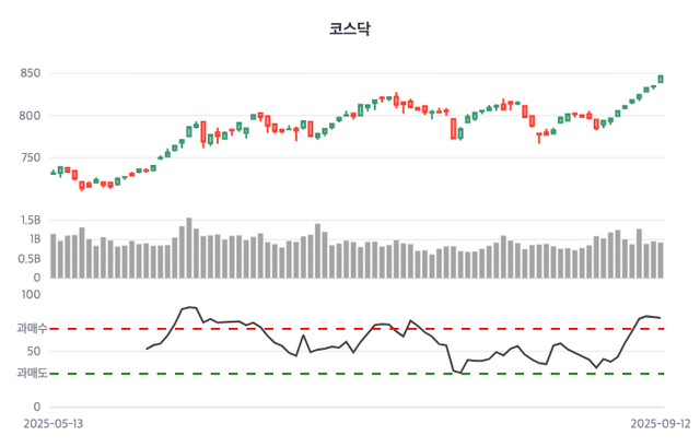 코스닥 지수는 이날 839.73에 출발해 847.16을 고점으로 기록한 뒤 847.08로 거래를 마쳤다. 전거래일 대비 12.32포인트(1.48%) 상승했고, 시작가보다는 7.35포인트(0.88%) 상승했다.