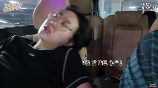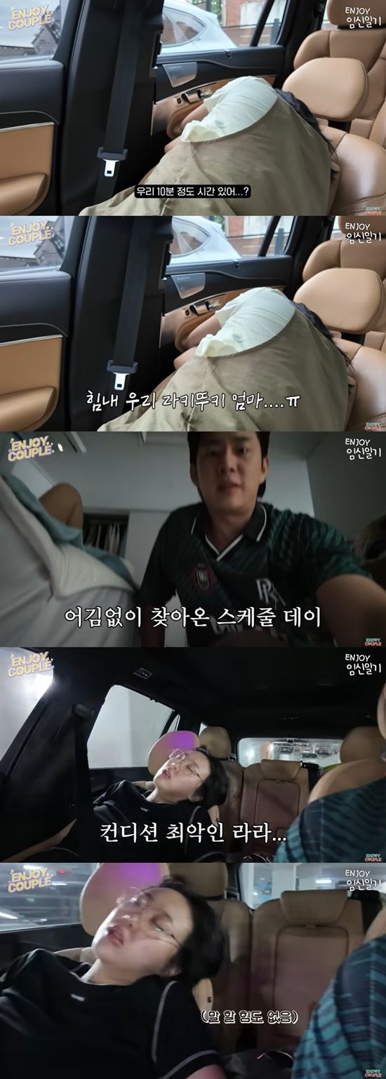 자막으로 "임신성 불면증이 시작됐다"라고 밝힌 임라라는 차에서도 쓰러진 채 힘겨워했다.
