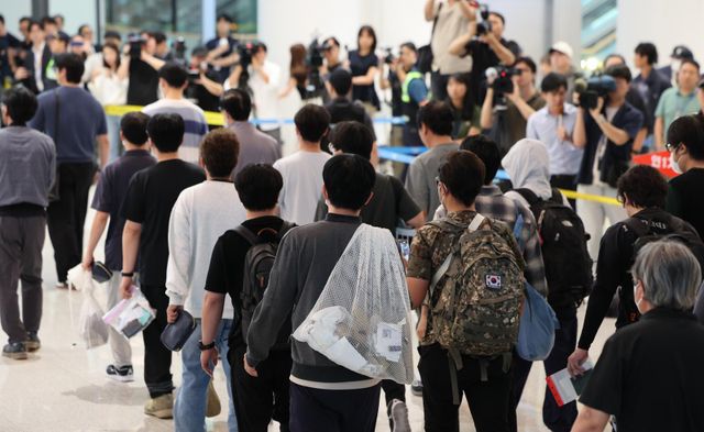 미국에 구금됐던 한국인 직원들이 12일 오후 인천국제공항을 통해 귀국하고 있다. 뉴스원