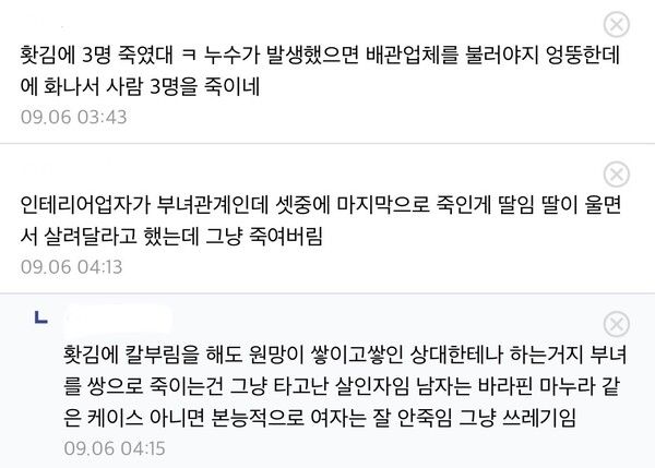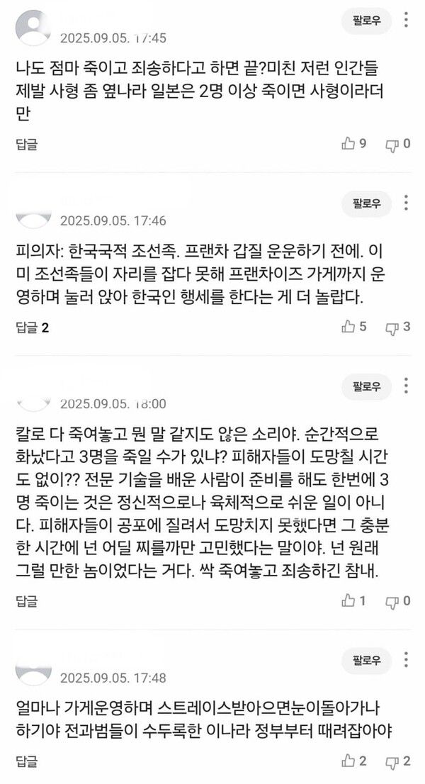 김씨는 사건 당일 가게 주방에서 본사 직원과 인테리어 업자 부녀를 상대로 흉기를 휘둘렀고, 피해자들은 모두 복부와 주요 부위에 치명상을 입고 병원으로 이송됐으나 끝내 숨졌다.