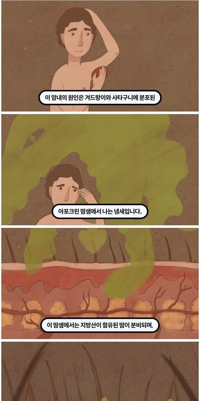= 아포크린땀샘 땀 분비가 활발해 암내가 심함