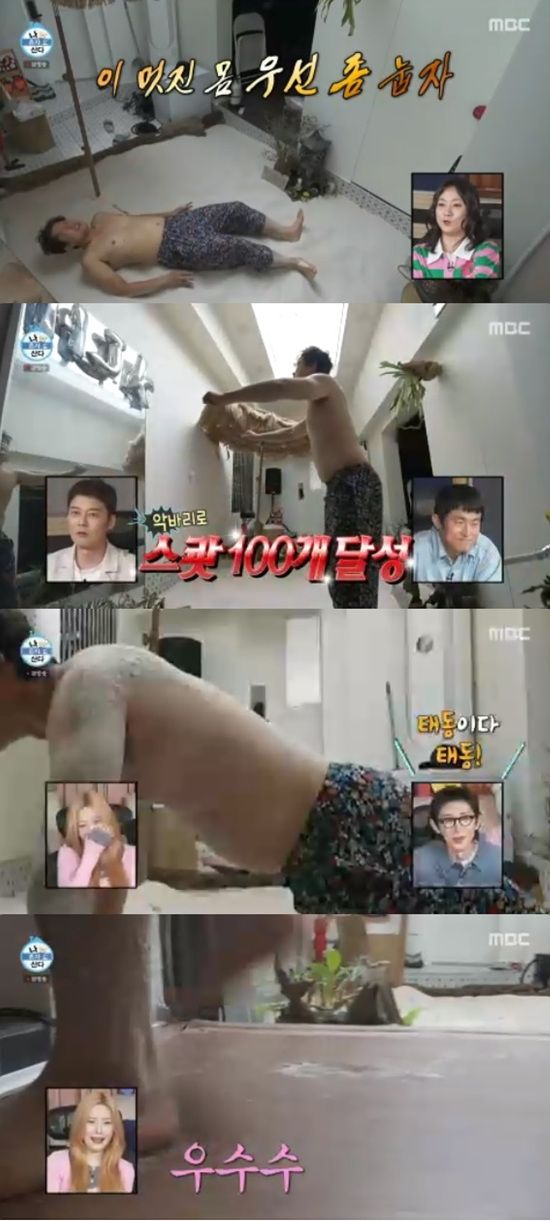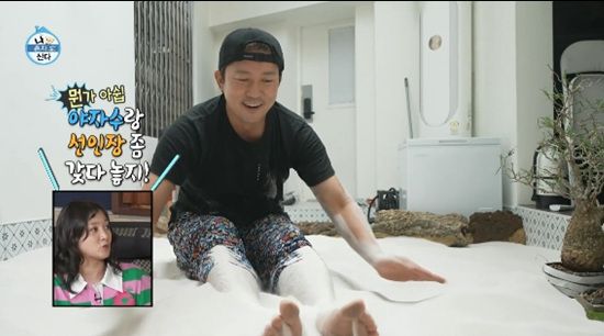 대운대에서 뒹굴던 김대호는 온몽에 모래가 잔뜩 묻은 채 집안을 걸어다니며 사우나로 들어갔다.