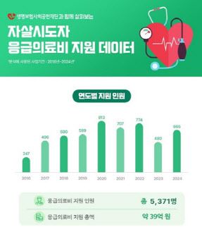 ‘자살시도자 응급의료비 지원’ 사업은 자살을 시도한 후 응급실에 내원한 이들의 경제적 부담을 덜어주기 위한 생명보험재단의 사업이다. 2016년 시작된 이 사업은 9년간 5525명에게 약 39억원의 치료비를 지원했다.