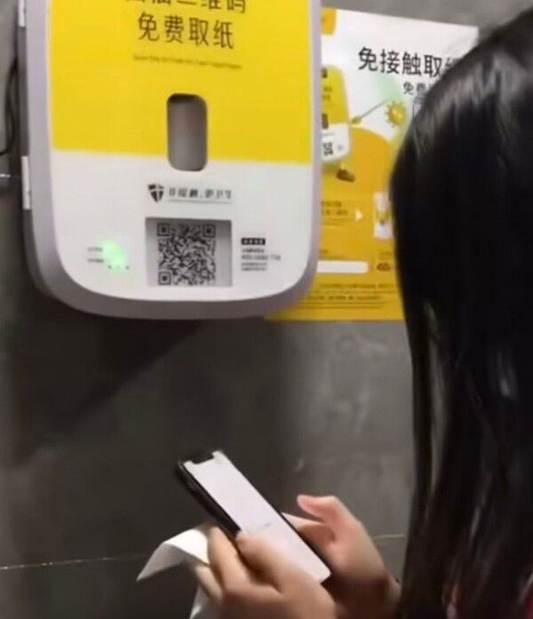 뉴시스 보도에 따르면, 9일(현지시각) 중국 디지털 매체 차이나인사이더가 소셜미디어(SNS)에 공개한 영상에는 한 여성이 화장실에서 QR코드를 스캔한 뒤 휴대전화로 광고를 시청하고 짧은 휴지 한 줄을 받는 장면이 담겼다.