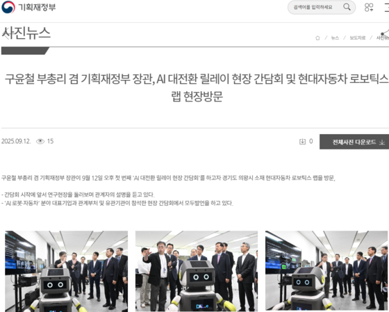 기획재정부는 12일 구윤철 부총리 겸 기재부 장관이 주재해 경기도 의왕시 현대차그룹 로보틱스랩에서 AI 로봇·자동차 분야 대표기업과 관계부처·유관기관이 참여한 가운데 AI 대전환 릴레이 현장 간담회를 열었다고 밝혔다.