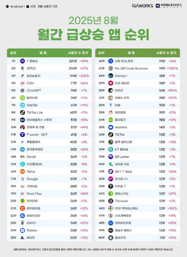 이어 CGV는 정부의 영화 할인 정책으로 77만 명 증가, 챗GPT 역시 꾸준한 기능 개선을 기반으로 74만 명을 추가 확보하며 TOP5에 이름을 올렸다.