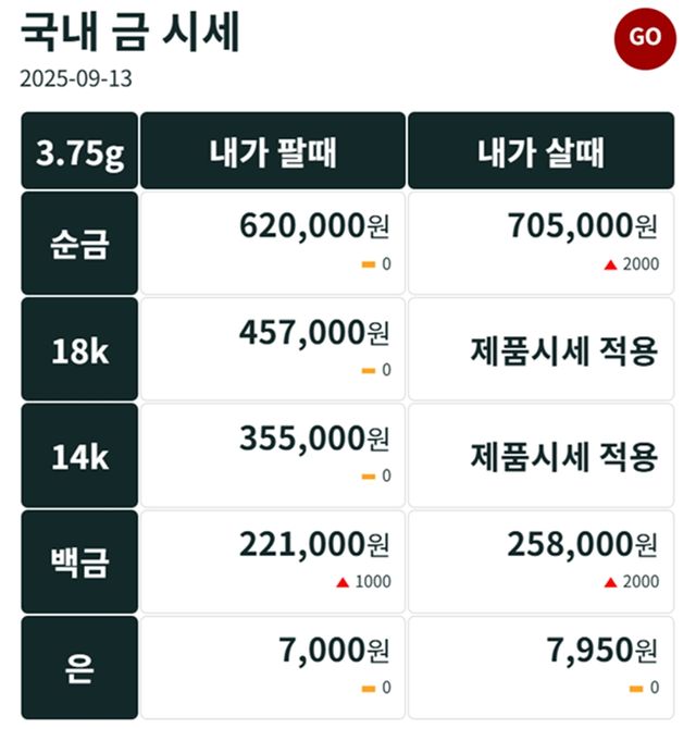 순금(24K) : 매입가 70만 5000원 / 매도가 62만 원