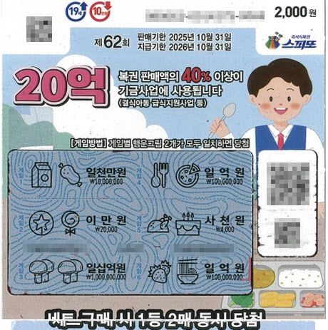 한편 ‘스피또2000’은 2000원에 구매할 수 있는 즉석 복권으로, 게임별 그림 2개가 모두 일치하면 당첨된다. 1등 당첨금은 10억원이며 한 세트를 구입할 경우 2장이 동시에 당첨될 수 있는 구조다.
