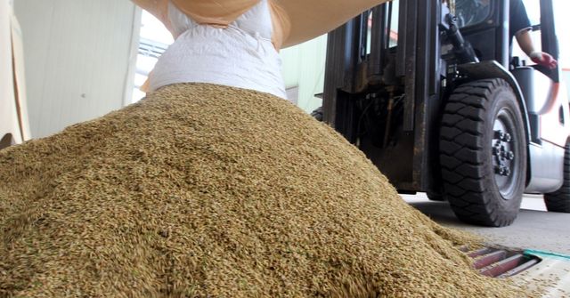 농민들이 갖 수확해온 햅쌀을 저장고에 쏟아 붓고 있다. 기사의 이해를 돕기 위한 사진 / 연합뉴스